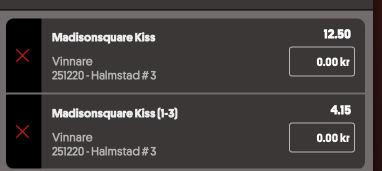 Jag spelar vinnare 12.50 och plats 4.15 på 13 MadisonSquare Kiss hos Svenska Spel.